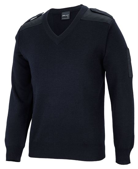 Details Classic Fit 50% Wool for warmth, and 50% Acrylic for easy care Woven epaulette with Hook-Pile Tape closure on both shoulders Woven elbow patches and two woven patch pen pockets on sleeve Full needle 12 gauge Ribbed sleeve cuffs and basque
